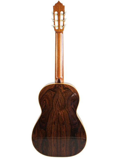 The level of detail is masterful: elegant purfling, refined rosette work, and a hand-carved Spanish heel construction. The ebony fingerboard remains smooth and fast, and the neck profile offers an inviting, traditional feel for serious concert players.
