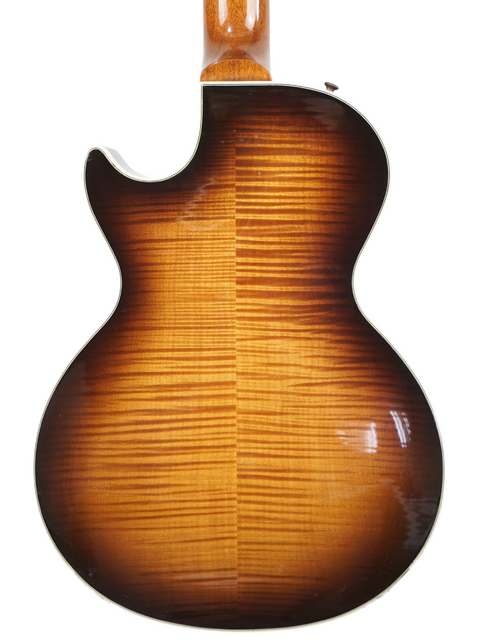 Finished in a rich, translucent Desert Burst nitrocellulose gloss, this example shows off beautifully figured maple on both faces of the body. The luxurious binding includes 7-ply top binding, 3-ply back binding, and 5-ply headstock binding, framing an intricate mother-of-pearl globe inlay, “Supreme” banner, and MOP Gibson logo. The bound ebony fingerboard features mother-of-pearl split-block inlays, matched with gold hardware, gold-tinted frets, and an engraved brass truss rod cover. Some light tarnishing on the gold appointments lends a touch of vintage charm and understated elegance, enhancing the Supreme’s aged appeal.